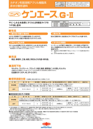 ヤニ・しみ止め効果と優れた付着性を有した、壁面用つや消し塗料。 アクリル樹脂系非水分散形塗料(弱溶剤系塗料)。