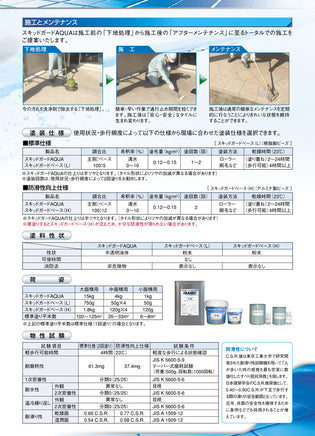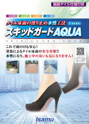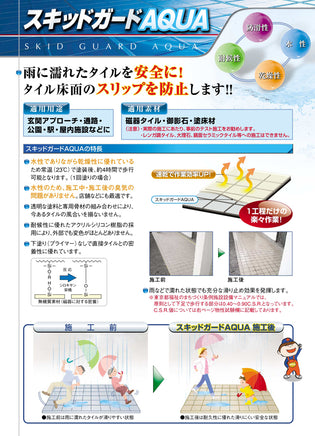 〇スキッドガードAQUAは水性1液型アクリルシリコン樹脂塗料と透明な骨材を混合して塗布する磁器タイル床用滑り止め塗料です。雨に濡れたタイル表面は滑りやすく、転倒事故の原因にもなっています。スキッドガードAQUAは透明性に優れており、タイルの風合いを損なわずに滑り止め機能を付与することが可能です。また水性塗料の中でも特に乾燥性に優れており、施工後4時間(23℃)にて歩行することが可能です。今あるタイルを貼り替えずに塗装で手軽に安全対策を施すことが可能です。水性塗料のため臭気がなく現場での施工に最適です。